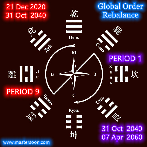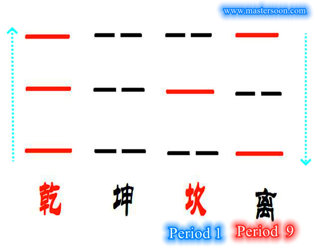 - Period 9(Li trigram 离卦) & Period 1(Kan trigram 坎卦) are 2 out of 4 Unchangeable Trigrams 四正卦 which occupy Actual North, East, South & West(4 Cardinals) in Early Heaven Bagua 先天八卦