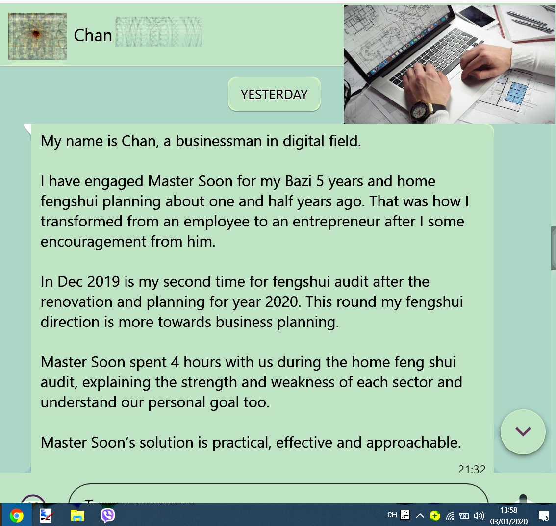 大约一年半前在机缘巧合之下,我请孙老师给本人的八字运程做预测演算以及后续的家居风水布局。加上孙老师的鼓励, 这是我如何从一名打工一族蜕变成企业家的过程。