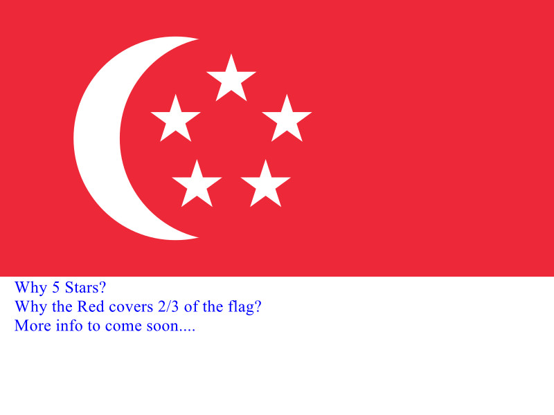 - Singapore plag is with 5 stars and a crescent. 2/3 is red(Chinese) and 1/3 is white(the West)