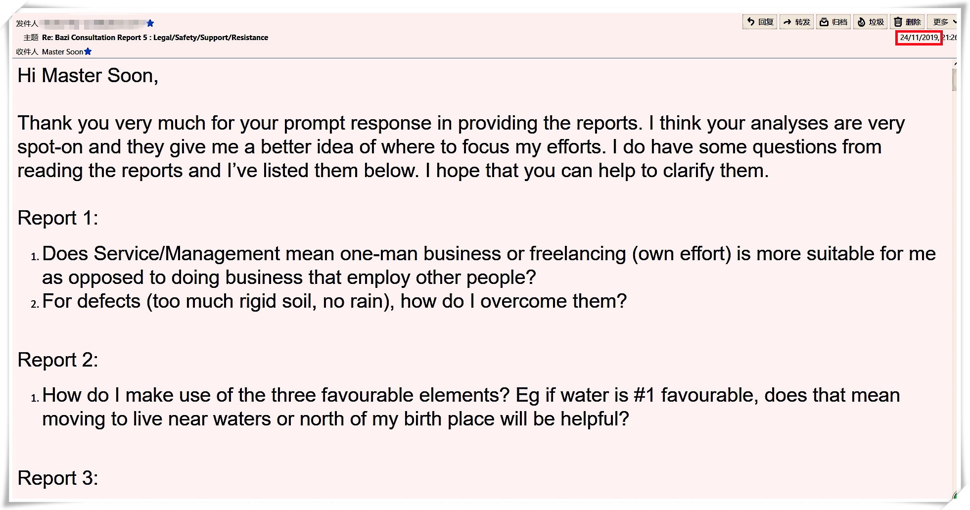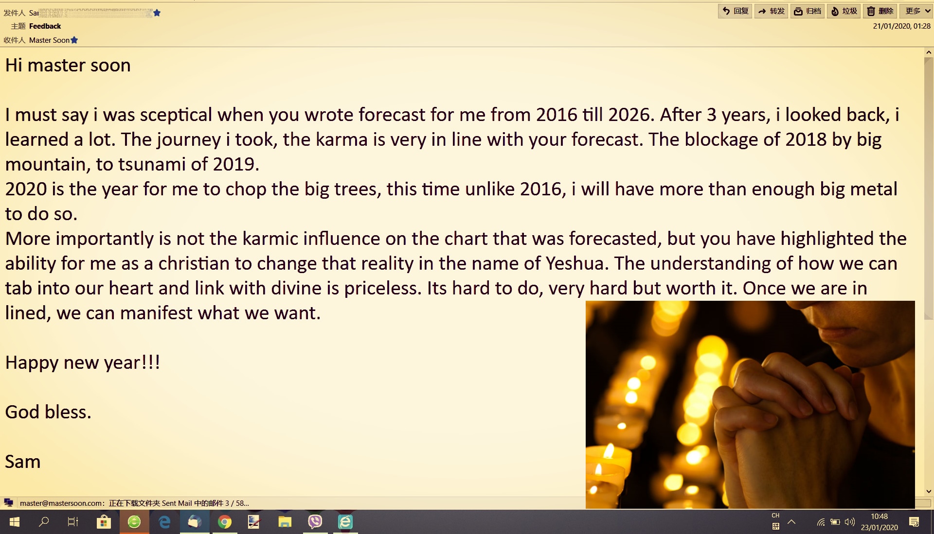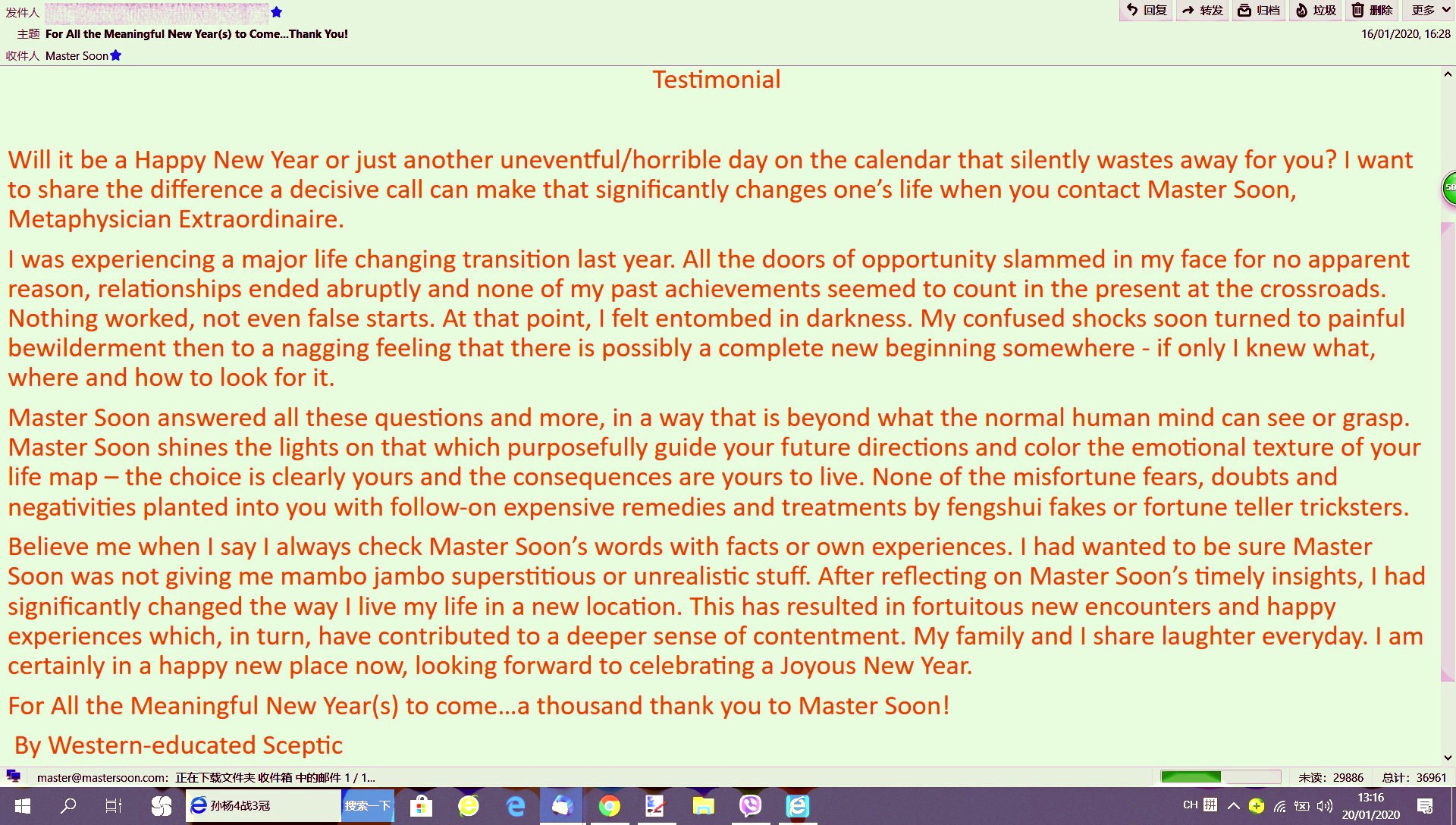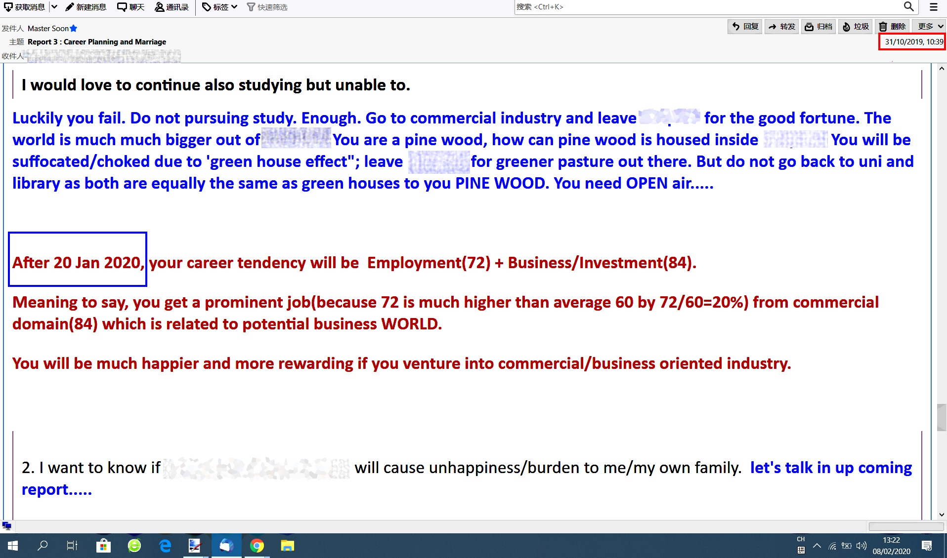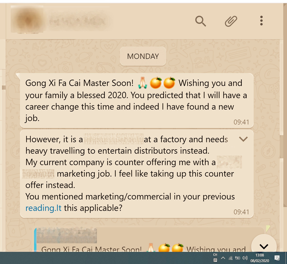 Received a Chinese New Year Greeting from one of my client on 03 Feb 2020; which I forecasted that he/she would get a much better job offer after 20 Jan 2020 as below.