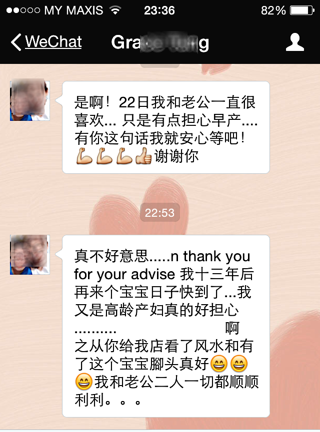 I am sorry(to text in such odd hour) and thank you for your advise. After 13 years, now I get my second child…. to deliver at such age makes me feel nervous a bit… … ah.. yes. …. After you audited my office cum resident house and getting this second baby; our “leg and head”(business deals/performance in Chinese dialect) are tremendously GOOD. I and my husband are having SMOOTH Luck now, All are very well…..