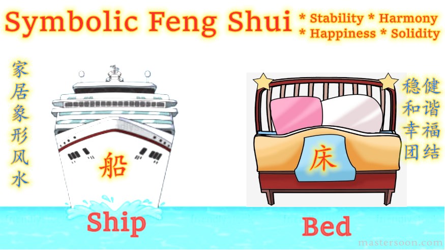 - Bed 床 is Ship船 symbolically in your home feng shui; for support, strength, stability, hope for your future and backbone to your family & procreation.