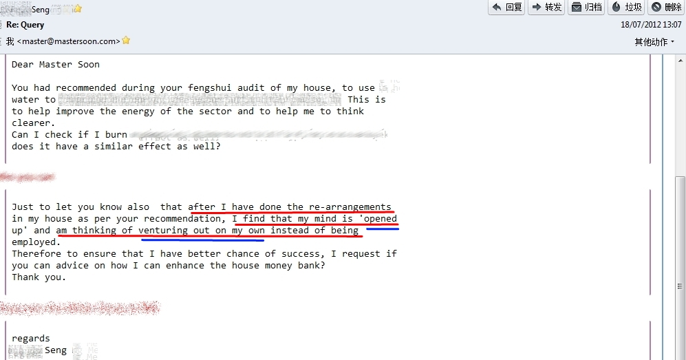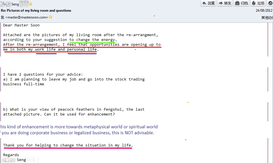 After I had replied and reconfirmed his email as above, he carried out feng shui activation. He wrote me again as below on 24 Aug 2012 (94 days) after site visit.